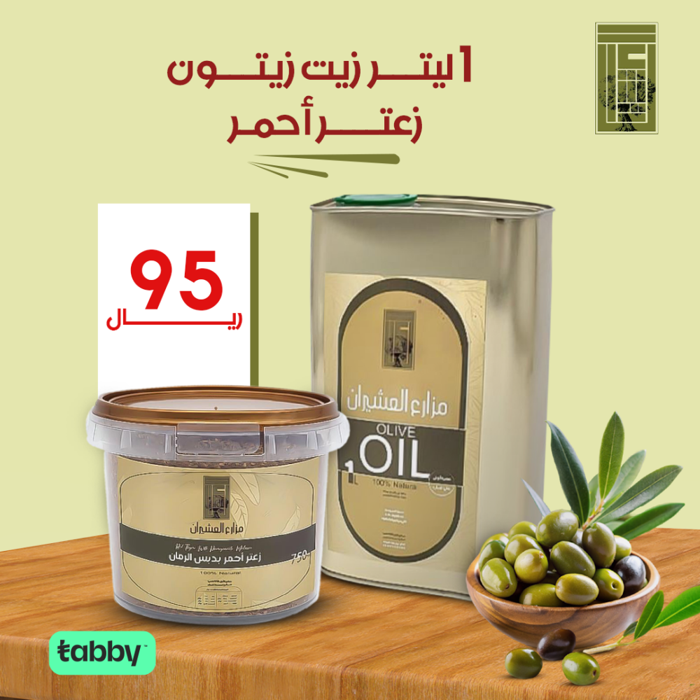 استمتع بتجربة مذاق لا مثيل له مع عرضنا الخاص على زيت زيتون بسعة 1 لتر بالإضافة إلى زعتر احمر طازج ومنعش. استخدم زيت زيتون الطازج بسعة 1 لتر في إعداد الأطباق الرئيسية والسلطات والمقبلات، حيث يمتاز بنكهة غنية ومتوازنة تضفي لمسة من الفخامة على كل طبق. ولا تفوت الفرصة لتجربة زعتر أحمر طازج، الذي يمتاز بنكهته القوية والعطرية والتي تضيف نكهة مميزة وعميقة إلى الأطباق.احصل على زيت زيتون بسعة 1 لتر مع زعتر أحمر طازج الآن واستمتع بالطعم الرائع والصحي.